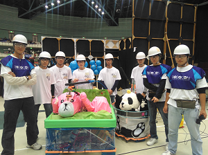 今年度の競技テーマは「大江戸ロボット忍法帳」です。2台のロボットが、相手のロボットと本陣に取り付けられた風船を割る競技です。本校からは、Aチームの新鮮組 (シンセングミ),BチームとのベアLINK”(ベアリング)の2チームが出場致しました。Aチームの新鮮組が、序盤から調子を上げ、見事、「優勝」致しました。BチームのベアLINK”は初戦を勝ち進みましたが、惜しくも2試合目に負けてしまいました。しかしながら、ロボットに搭載された秘密道具(ブーメラン型の飛び道具)が会場を沸かし、他に類を見ない独創的なアイディアを実現し、それが高く評価され「アイディア賞」と「特別賞」のW受賞となりました。