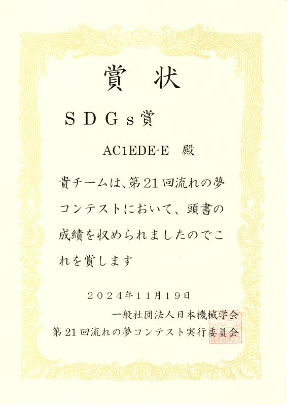 令和6年11月19日(火)にアオーレ長岡ナカドマで開催されました、一般社団法人日本機械学会流体工学部門主催「第21回 流れの夢コンテスト」に、本校専攻科1年生のチームが参加し、SDGs賞を受賞しました。