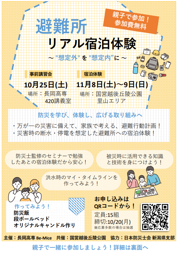 長岡高専のプレラボチームBe-Miceが「避難所リアル宿泊体験〜想定外を想定内に〜」という、防災に関する体験型ワークショップを開催します。