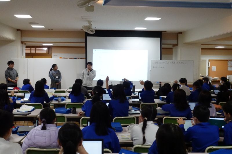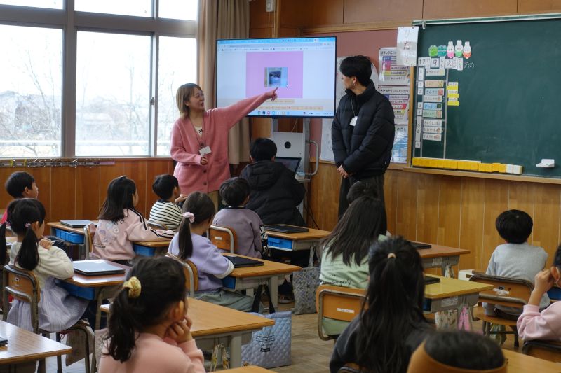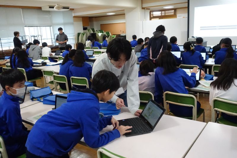 11月28日には5年生全体(3クラス)を対象とした授業の中で、12月9日は1年生1クラスを対象とした授業の中で、開発した教材を活用した授業を実践してもらいました。教材を開発した学生たちも授業の補助として参加しました。教材を使った子どもたちからは「楽しかった」「簡単に使えてよかった」などの感想が出ていました。実際に子どもたちが教材を使っている様子を見て、自分たちが作ったサービスを使ってもらえることの喜びと責任感を改めて実感することができ、学生たちにとって貴重な経験となりました。