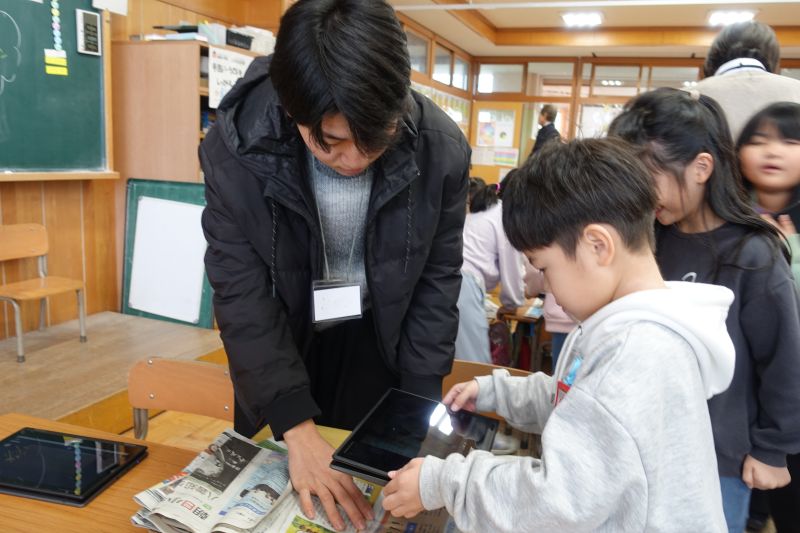 今回使われた教材は、新聞の中のお気に入りの写真を紹介するスライドを簡単に作成できるWebアプリと、オリジナル新聞を簡単に作成できるWebアプリの2つでした。それぞれ小学1年生と5年生を対象に開発したもので、新聞を活用した教育 (NIE: Newspaper in Education)の実践指定校に選ばれている葛巻小学校と連携しながら開発を進めたものでした。