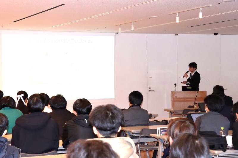 専攻科1年生44名は英語でのショートプレゼンテーションとポスター発表を行いました。中間発表の位置づけながら,初めての発表会に緊張しつつも,研究の目的や工夫を自分の言葉で伝え,来場者と活発に議論する姿が印象的でした。専攻科2年生29名は口頭発表に臨み,特別研究の集大成として,質疑応答まで含め堂々とした発表を行い,会場から大きな拍手が送られました。