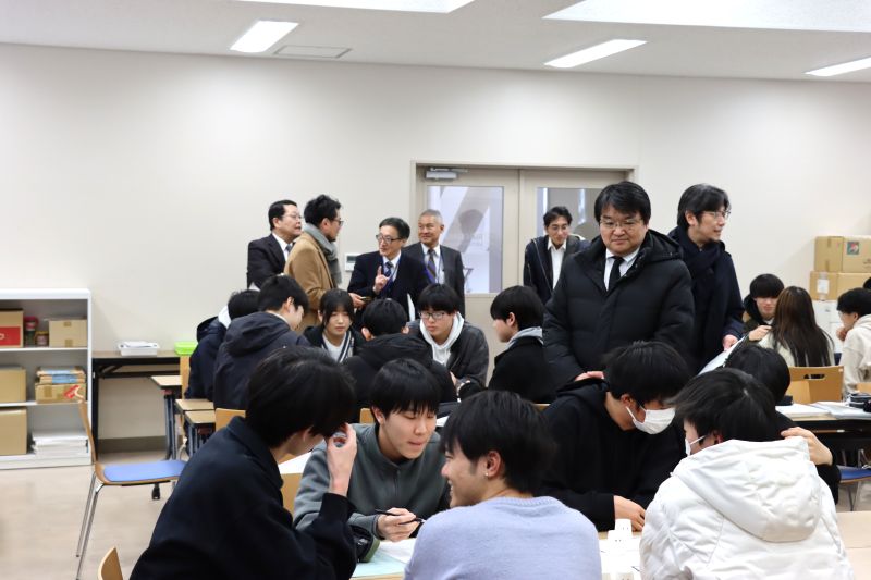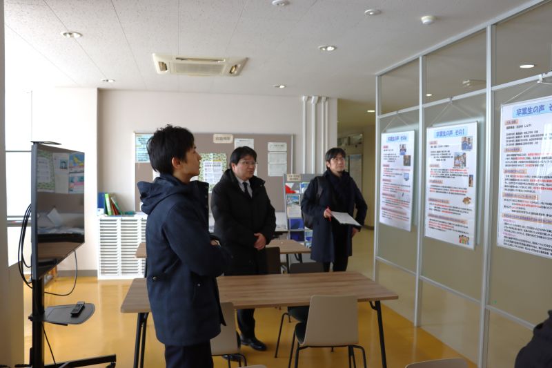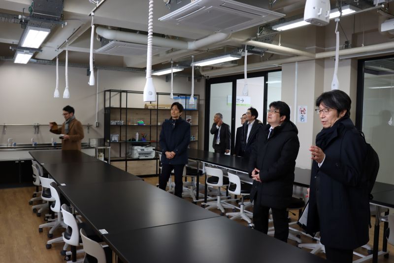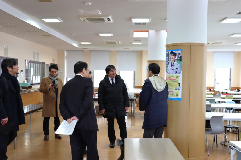 施設の視察では、インキュベーションルーム、1年生教室、イノベーションラボ(起業家工房)、各学科の学習スペース、そしてネーミングライツ施設である学生食堂「ゆにおん食堂」などを順にご案内し、本校の教育環境の整備状況をご紹介しました。