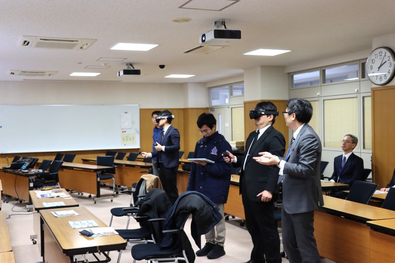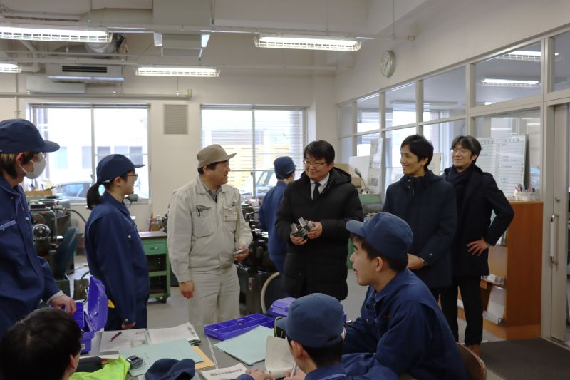 また、授業見学として、電気電子システム工学科2年「ものづくり技術演習Ⅱ」(AIルーム)、1年生「美術」(MACOHO Lecture Room(440講義室))、機械工学科2年「機械工学実験実習Ⅱ」(機械工場)をご覧いただき、高専ならではの実践的な学びの様子を見ていただきました。