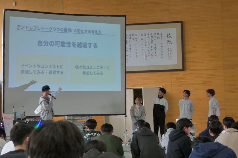 大画面のスクリーンにプロジェクターを使用して紹介を行ったり、ステージ上で実際に演奏・実演を行うなど,それぞれの部・クラブが積極的に新入生にアピールをしていました。