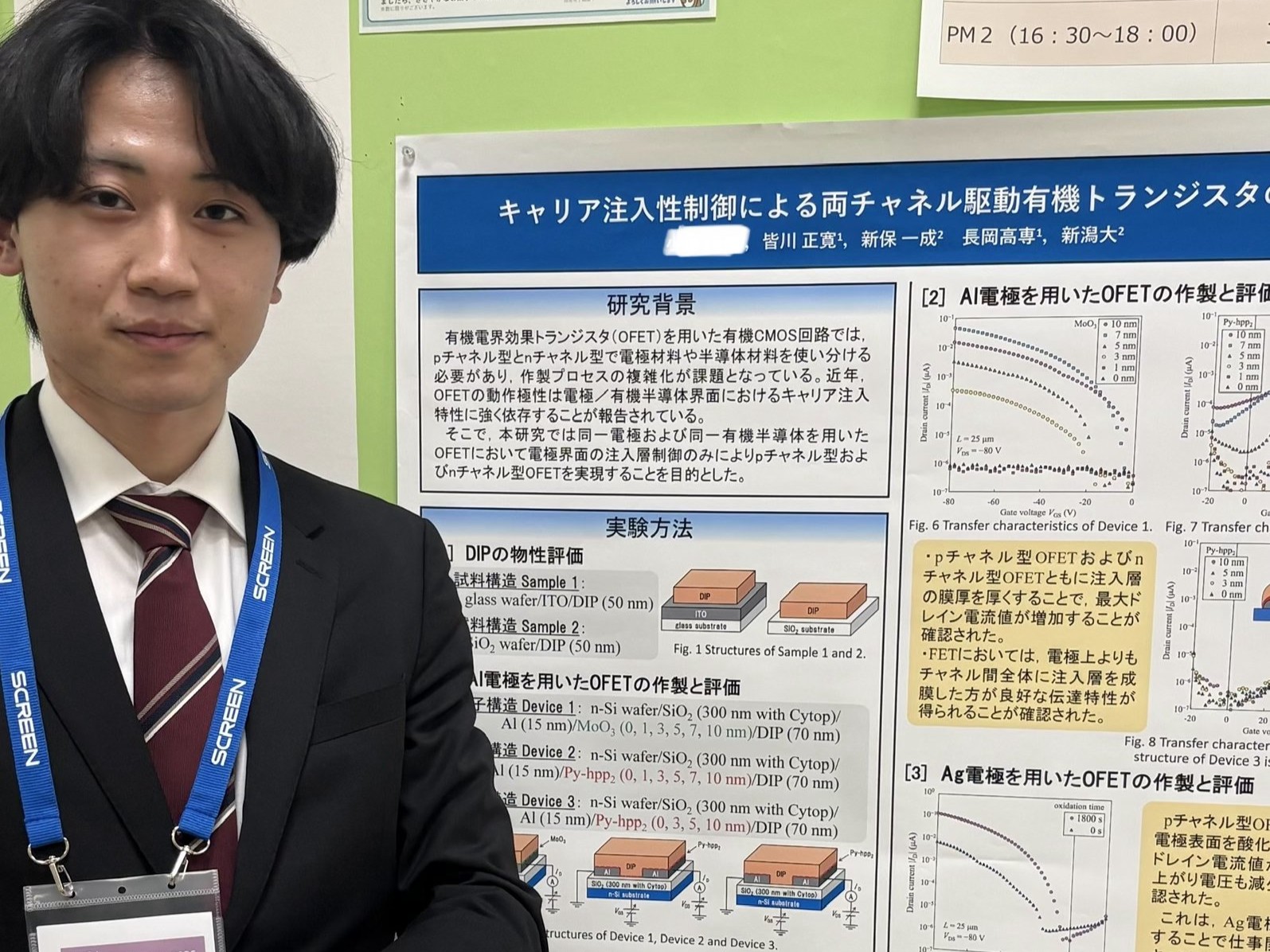 昨年6月に開催された電気学会誘電・絶縁材料研究会において,曲げ伸ばしが可能な有機半導体材料について, 結晶の粒径とトランジスタの出力電流の相関に関する研究発表を行いました。