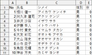 A 列は通番,B 列は氏名,C 列は氏名のフリガナ,D 列は性別,E 列は入寮の有無を表しています.