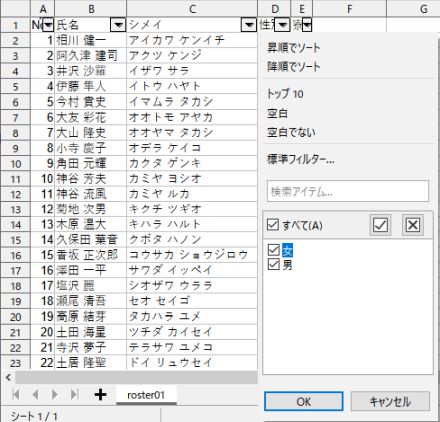 図1 には表示されていませんが,シートの左下には開いた CSV ファイル名と同じ「roster01」というシート名を表すタブがあるはずです (図4 参照).