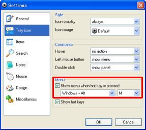 図19・Settings-Tray icon - Panel の項目にある Show panel when hot key is pressed のチェックボックス (図の赤枠) をオンにします. デフォルトでは,ホットキーとして Windows キーと Alt キーを同時に押し下げたまま,M キーをタイプする組合せになっています (Windows+Alt+M と表記します). それ以外の組合せに変更することも可能ですので,自分なりに使いやすい組合せを試してください.