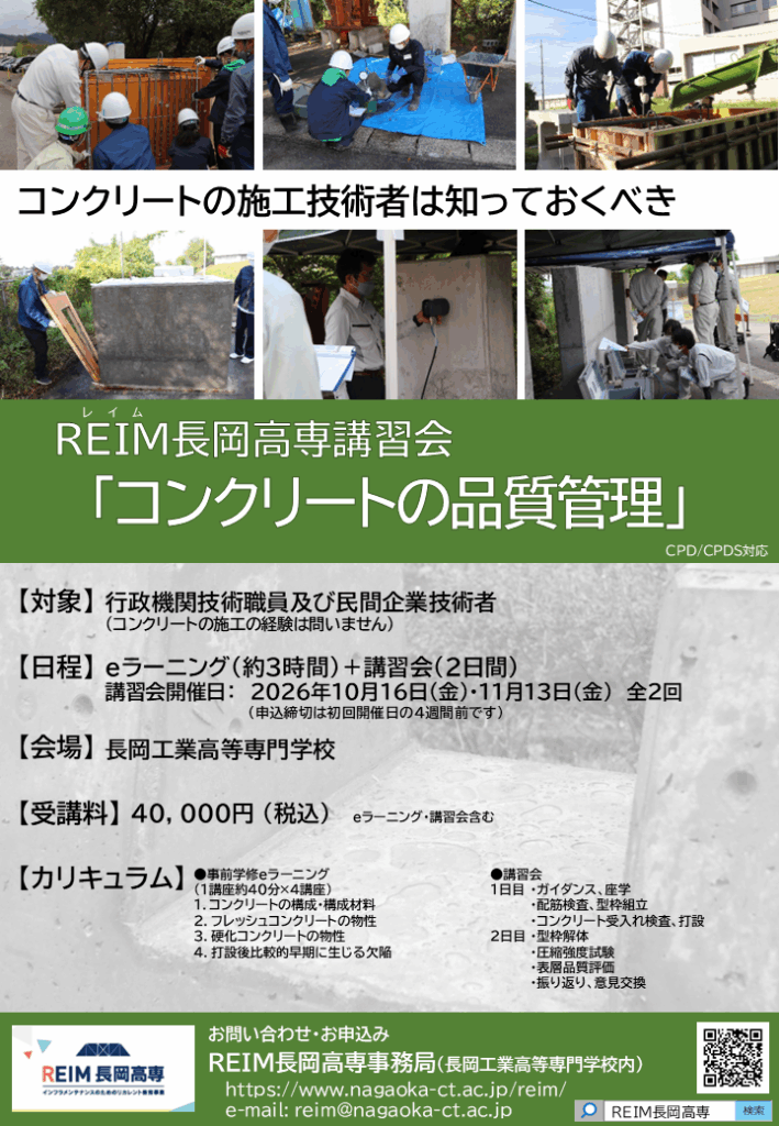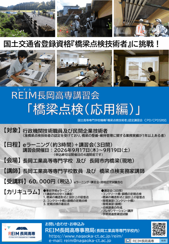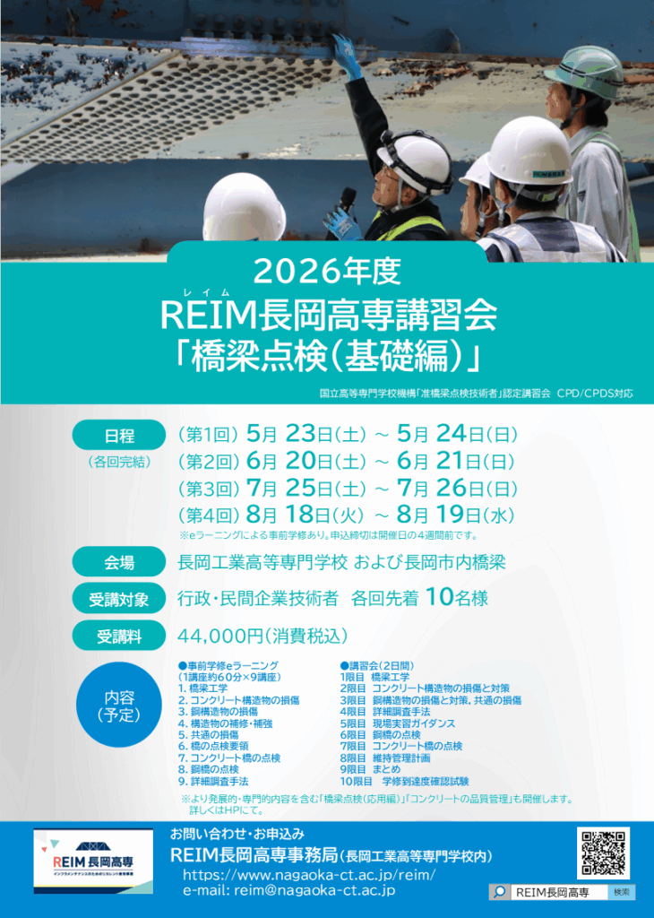 2026年度も、REIM長岡高専では「橋梁点検(基礎編)」「橋梁点検(応用編)」「コンクリートの品質管理」の3講座を開催します。開催日程は以下の通りです。